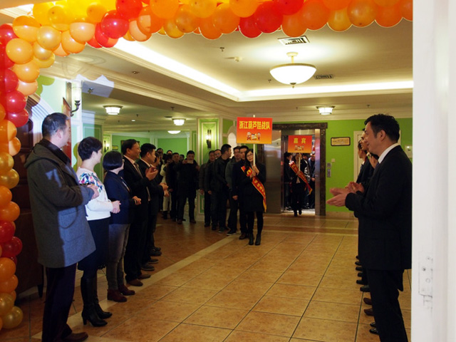 董事会成员与杭州营销中心管理团队列队欢迎嘉宾、员工入场